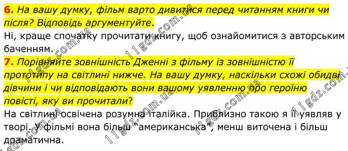6. На вашу думку, фільм варто дивитися перед читанням книги чи після? Відповідь аргументуйте. Ні, краще спочатку прочитати книгу, щоб ознайомитися з авторським баченням. 7. Порівняйте зовнішність Дженні з фільму із зовнішністю її прототипу на світлині нижче. На вашу думку, наскільки схожі обидві дівчини і чи відповідають вони вашому уявленню про героїню повісті, яку ви прочитали? На світлині освічена розумна італійка. Приблизно такою я її уявляв у творі. У фільмі вона більш “американська”, менш виточена і більш драматична.