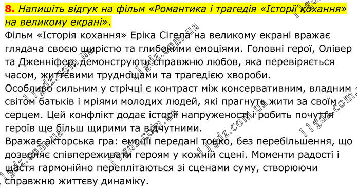 8. Напишіть відгук на фільм «Романтика і трагедія «Історії кохання» на великому екрані». Фільм «Історія кохання» Еріка Сігела на великому екрані вражає глядача своєю щирістю та глибокими емоціями. Головні герої, Олівер та Дженніфер, демонструють справжню любов, яка перевіряється часом, життєвими труднощами та трагедією хвороби. Особливо сильним у стрічці є контраст між консервативним, владним світом батьків і мріями молодих людей, які прагнуть жити за своїм серцем. Цей конфлікт додає історії напруженості і робить почуття героїв ще більш щирими та відчутними. Вражає акторська гра: емоції передані тонко, без перебільшення, що дозволяє співпереживати героям у кожній сцені. Моменти радості і щастя гармонійно переплітаються зі сценами суму, створюючи справжню життєву динаміку.