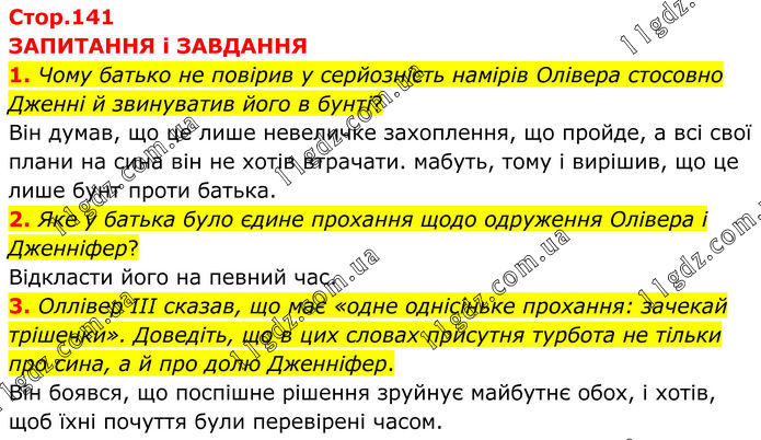 ЗАПИТАННЯ і ЗАВДАННЯ 1. Чому батько не повірив у серйозність намірів Олівера стосовно Дженні й звинуватив його в бунті? Він думав, що це лише невеличке захоплення, що пройде, а всі свої плани на сина він не хотів втрачати. мабуть, тому і вирішив, що це лише бунт проти батька. 2. Яке у батька було єдине прохання щодо одруження Олівера і Дженніфер? Відкласти його на певний час. 3. Оллівер III сказав, що має «одне однісіньке прохання: зачекай трішечки». Доведіть, що в цих словах присутня турбота не тільки про сина, а й про долю Дженніфер. Він боявся, що поспішне рішення зруйнує майбутнє обох, і хотів, щоб їхні почуття були перевірені часом.