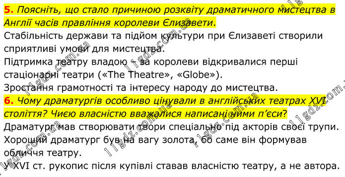 5. Поясніть, що стало причиною розквіту драматичного мистецтва в Англії часів правління королеви Єлизавети. Стабільність держави та підйом культури при Єлизаветі створили сприятливі умови для мистецтва. Підтримка театру владою – за королеви відкривалися перші стаціонарні театри («The Theatre», «Globe»). Зростання грамотності та інтересу народу до мистецтва. 6. Чому драматургів особливо цінували в англійських театрах XVI століття? Чиєю власністю вважалися написані ними п’єси? Драматург мав створювати твори спеціально під акторів своєї трупи. Хороший драматург був на вагу золота, бо саме він формував обличчя театру. У XVI ст. рукопис після купівлі ставав власністю театру, а не автора.