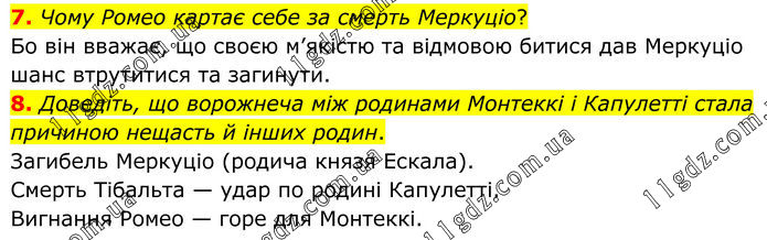 7. Чому Ромео картає себе за смерть Меркуціо? Бо він вважає, що своєю м’якістю та відмовою битися дав Меркуціо шанс втрутитися та загинути. 8. Доведіть, що ворожнеча між родинами Монтеккі і Капулетті стала причиною нещасть й інших родин. Загибель Меркуціо (родича князя Ескала). Смерть Тібальта — удар по родині Капулетті. Вигнання Ромео — горе для Монтеккі.