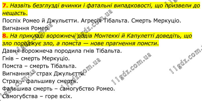 7. Назвіть безглузді вчинки і фатальні випадковості, що призвели до нещасть. Поспіх Ромео й Джульєтти. Агресія Тібальта. Смерть Меркуціо. Вигнання Ромео. 8. На прикладі ворожнечі родів Монтеккі й Капулетті доведіть, що зло породжує зло, а помста — нове прагнення помсти. Давня ворожнеча породила гнів Тібальта. Гнів – смерть Меркуціо. Помста – смерть Тібальта. Вигнання – страх Джульєтти. Страх – фальшиву смерть. Фальшива смерть – самогубство Ромео. Самогубства – горе всіх.