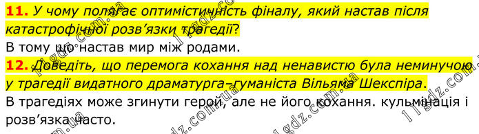 11. У чому полягає оптимістичність фіналу, який настав після катастрофічної розв’язки трагедії? В тому що настав мир між родами. 12. Доведіть, що перемога кохання над ненавистю була неминучою у трагедії видатного драматурга–гуманіста Вільяма Шекспіра. В трагедіях може згинути герой, але не його кохання. кульмінація і розв’язка часто.
