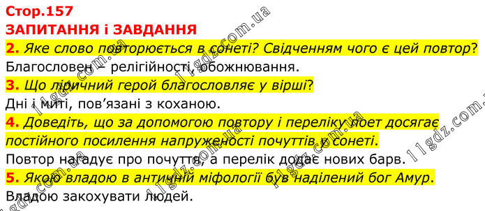 ЗАПИТАННЯ і ЗАВДАННЯ 2. Яке слово повторюється в сонеті? Свідченням чого є цей повтор? Благословен – релігійності, обожнювання. 3. Що ліричний герой благословляє у вірші? Дні і миті, пов’язані з коханою. 4. Доведіть, що за допомогою повтору і переліку поет досягає постійного посилення напруженості почуттів у сонеті. Повтор нагадує про почуття, а перелік додає нових барв. 5. Якою владою в античній міфології був наділений бог Амур. Владою закохувати людей.