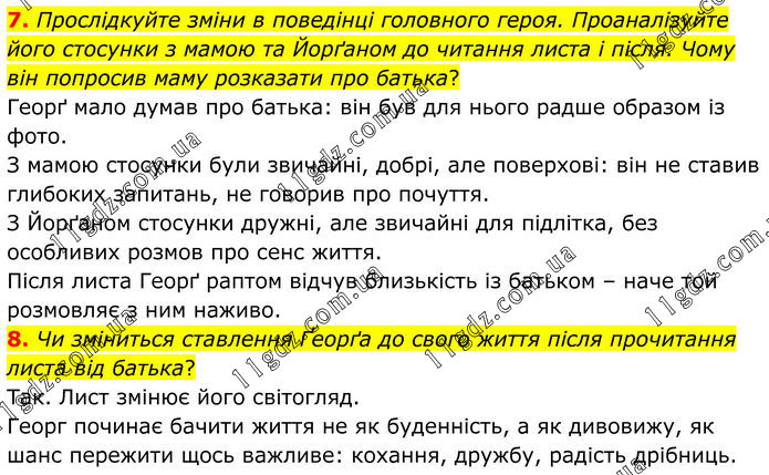 7. Прослідкуйте зміни в поведінці головного героя. Проаналізуйте його стосунки з мамою та Йорґаном до читання листа і після. Чому він попросив маму розказати про батька? Георґ мало думав про батька: він був для нього радше образом із фото. З мамою стосунки були звичайні, добрі, але поверхові: він не ставив глибоких запитань, не говорив про почуття. З Йорґаном стосунки дружні, але звичайні для підлітка, без особливих розмов про сенс життя. Після листа Георґ раптом відчув близькість із батьком – наче той розмовляє з ним наживо. 8. Чи зміниться ставлення Ґеорґа до свого життя після прочитання листа від батька? Так. Лист змінює його світогляд. Георг починає бачити життя не як буденність, а як дивовижу, як шанс пережити щось важливе: кохання, дружбу, радість дрібниць.
