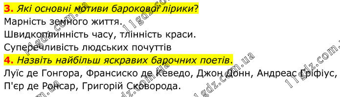 3. Які основні мотиви барокової лірики? Марність земного життя. Швидкоплинність часу, тлінність краси. Суперечливість людських почуттів. 4. Назвіть найбільш яскравих барочних поетів. Луїс де Гонгора, Франсиско де Кеведо, Джон Донн, Андреас Гріфіус, П'єр де Ронсар, Григорій Сковорода.