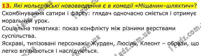 13. Які мольєрівські нововведення є в комедії «Міщанин–шляхтич»? Скомбінування сатири і фарсу: глядач одночасно сміється і отримує моральний урок. Соціальна тематика: показ конфлікту між різними верствами суспільства. Яскраві, типізовані персонажі: Журден, Люсіль, Клеонт – образи, що легко впізнаються і наслідуються.