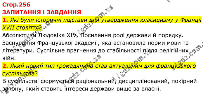 ЗАПИТАННЯ і ЗАВДАННЯ 1. Які були історичні підстави для утвердження класицизму у Франції XVII століття? Абсолютизм Людовіка XIV. Посилення ролі держави й порядку. Заснування Французької академії, яка встановила норми мови та літератури. Суспільне прагнення до стабільності після релігійних війн. 2. Який новий тип громадянина став актуальним для французького суспільства? В суспільстві формується раціональний, дисциплінований, покірний закону, який ставить інтереси держави вище за власні.