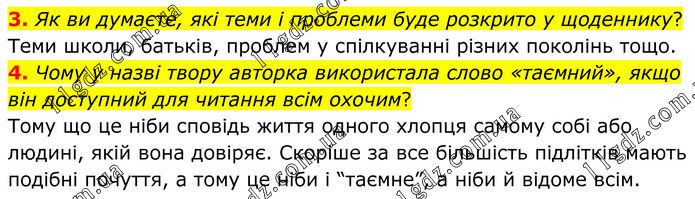 3. Як ви думаєте, які теми і проблеми буде розкрито у щоденнику? Теми школи, батьків, проблем у спілкуванні різних поколінь тощо. 4. Чому у назві твору авторка використала слово «таємний», якщо він доступний для читання всім охочим? Тому що це ніби сповідь життя одного хлопця самому собі або людині, якій вона довіряє. Скоріше за все більшість підлітків мають подібні почуття, а тому це ніби і “таємне”, а ніби й відоме всім.