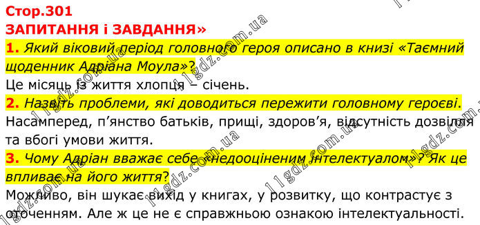 ЗАПИТАННЯ і ЗАВДАННЯ 1. Який віковий період головного героя описано в книзі «Таємний щоденник Адріана Моула»? Це місяць із життя хлопця – січень. 2. Назвіть проблеми, які доводиться пережити головному героєві. Насамперед, п’янство батьків, прищі, здоров’я, відсутність дозвілля та вбогі умови життя. 3. Чому Адріан вважає себе «недооціненим інтелектуалом»? Як це впливає на його життя? Можливо, він шукає вихід у книгах, у розвитку, що контрастує з оточенням. Але ж це не є справжньою ознакою інтелектуальності.