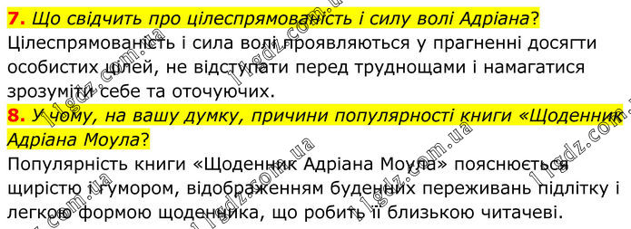7. Що свідчить про цілеспрямованість і силу волі Адріана? Цілеспрямованість і сила волі проявляються у прагненні досягти особистих цілей, не відступати перед труднощами і намагатися зрозуміти себе та оточуючих. 8. У чому, на вашу думку, причини популярності книги «Щоденник Адріана Моула? Популярність книги «Щоденник Адріана Моула» пояснюється щирістю і гумором, відображенням буденних переживань підлітку і легкою формою щоденника, що робить її близькою читачеві.