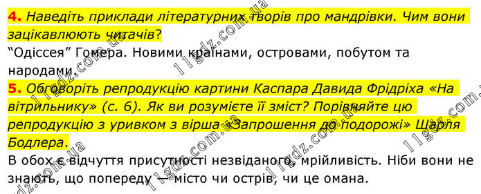 4. Наведіть приклади літературних творів про мандрівки. Чим вони зацікавлюють читачів? “Одіссея” Гомера. Новими країнами, островами, побутом та народами. 5. Обговоріть репродукцію картини Каспара Давида Фрідріха «На вітрильнику» (с. 6). Як ви розумієте її зміст? Порівняйте цю репродукцію з уривком з вірша «Запрошення до подорожі» Шарля Бодлера. В обох є відчуття присутності незвіданого, мрійливість. Ніби вони не знають, що попереду — місто чи острів, чи це омана.
