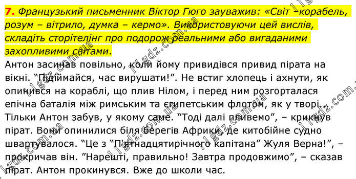 7. Французький письменник Віктор Гюго зауважив: «Світ –корабель, розум – вітрило, думка – кермо». Використовуючи цей вислів, складіть сторітелінг про подорож реальними або вигаданими захопливими світами. Антон засинав повільно, коли йому привидівся привид пірата на вікні. “Підіймайся, час вирушати!”. Не встиг хлопець і ахнути, як опинився на кораблі, що плив Нілом, і перед ним розгорталася епічна баталія між римським та єгипетським флотом, як у творі... Тільки Антон забув, у якому саме. “Тоді далі пливемо”, – крикнув пірат. Вони опинилися біля берегів Африки, де китобійне судно швартувалося. “Це з “П'ятнадцятирічного капітана” Жуля Верна!”, – прокричав він. ”Нарешті, правильно! Завтра продовжимо”, – сказав пірат. Антон прокинувся. Вже до школи час.