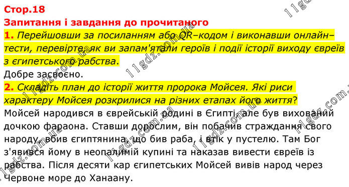 Запитання і завдання до прочитаного 1. Перейшовши за посиланням або QR–кодом і виконавши онлайн–тести, перевірте, як ви запам'ятали героїв і події історії виходу євреїв з єгипетського рабства. Добре засвоєно. 2. Складіть план до історії життя пророка Мойсея. Які риси характеру Мойсея розкрилися на різних етапах його життя? Мойсей народився в єврейській родині в Єгипті, але був вихований дочкою фараона. Ставши дорослим, він побачив страждання свого народу, вбив єгиптянина, що бив раба, і втік у пустелю. Там Бог з'явився йому в неопалимій купині та наказав вивести євреїв із рабства. Після десяти кар єгипетських Мойсей вивів народ через Червоне море до Ханаану.
