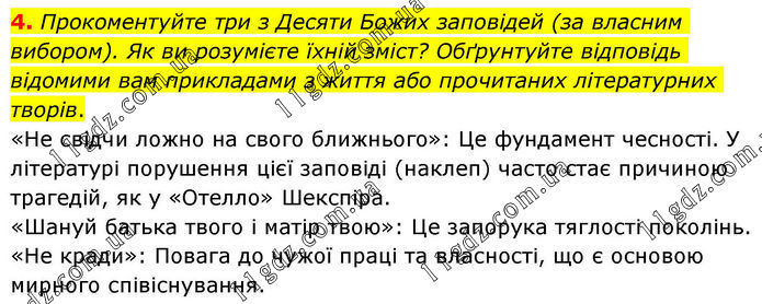 4. Прокоментуйте три з Десяти Божих заповідей (за власним вибором). Як ви розумієте їхній зміст? Обґрунтуйте відповідь відомими вам прикладами з життя або прочитаних літературних творів. «Не свідчи ложно на свого ближнього»: Це фундамент чесності. У літературі порушення цієї заповіді (наклеп) часто стає причиною трагедій, як у «Отелло» Шекспіра. «Шануй батька твого і матір твою»: Це запорука тяглості поколінь. «Не кради»: Повага до чужої праці та власності, що є основою мирного співіснування.