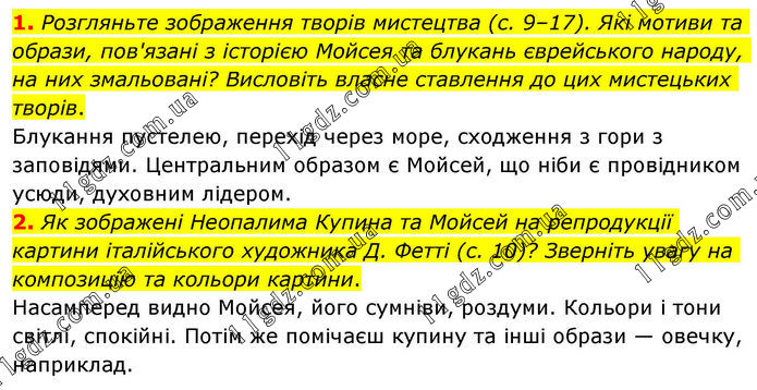 1. Розгляньте зображення творів мистецтва (с. 9–17). Які мотиви та образи, пов'язані з історією Мойсея та блукань єврейського народу, на них змальовані? Висловіть власне ставлення до цих мистецьких творів. Блукання пустелею, перехід через море, сходження з гори з заповідями. Центральним образом є Мойсей, що ніби є провідником усюди, духовним лідером. 2. Як зображені Неопалима Купина та Мойсей на репродукції картини італійського художника Д. Фетті (с. 10)? Зверніть увагу на композицію та кольори картини. Насамперед видно Мойсея, його сумніви, роздуми. Кольори і тони світлі, спокійні. Потім же помічаєш купину та інші образи — овечку, наприклад.