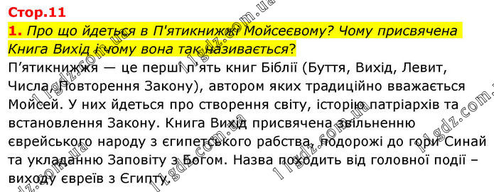 1. Про що йдеться в П'ятикнижжі Мойсеєвому? Чому присвячена Книга Вихід і чому вона так називається? П’ятикнижжя — це перші п'ять книг Біблії (Буття, Вихід, Левит, Числа, Повторення Закону), автором яких традиційно вважається Мойсей. У них йдеться про створення світу, історію патріархів та встановлення Закону. Книга Вихід присвячена звільненню єврейського народу з єгипетського рабства, подорожі до гори Синай та укладанню Заповіту з Богом. Назва походить від головної події – виходу євреїв з Єгипту.