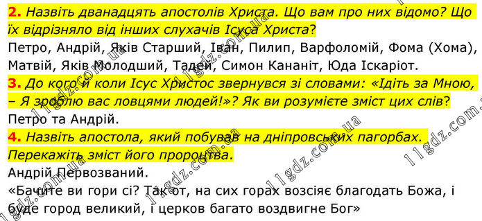 2. Назвіть дванадцять апостолів Христа. Що вам про них відомо? Що їх відрізняло від інших слухачів Ісуса Христа? Петро, Андрій, Яків Старший, Іван, Пилип, Варфоломій, Фома (Хома), Матвій, Яків Молодший, Тадей, Симон Кананіт, Юда Іскаріот. 3. До кого й коли Ісус Христос звернувся зі словами: «Ідіть за Мною, – Я зроблю вас ловцями людей!»? Як ви розумієте зміст цих слів? Петро та Андрій. 4. Назвіть апостола, який побував на дніпровських пагорбах. Перекажіть зміст його пророцтва. Андрій Первозваний. «Бачите ви гори сі? Так от, на сих горах возсіяє благодать Божа, і буде город великий, і церков багато воздвигне Бог»