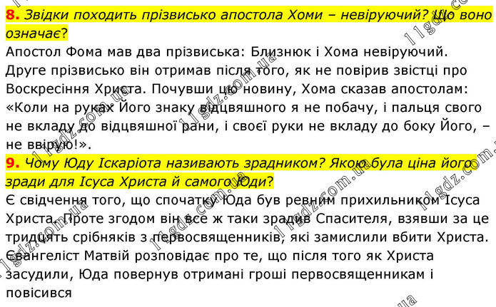 8. Звідки походить прізвисько апостола Хоми – невіруючий? Що воно означає? Апостол Фома мав два прізвиська: Близнюк і Хома невіруючий. Друге прізвисько він отримав після того, як не повірив звістці про Воскресіння Христа. Почувши цю новину, Хома сказав апостолам: «Коли на руках Його знаку відцвяшного я не побачу, і пальця свого не вкладу до відцвяшної рани, і своєї руки не вкладу до боку Його, – не ввірую!». 9. Чому Юду Іскаріота називають зрадником? Якою була ціна його зради для Ісуса Христа й самого Юди? Є свідчення того, що спочатку Юда був ревним прихильником Ісуса Христа. Проте згодом він все ж таки зрадив Спасителя, взявши за це тридцять срібняків з первосвященників, які замислили вбити Христа. Євангеліст Матвій розповідає про те, що після того як Христа засудили, Юда повернув отримані гроші первосвященникам і повісився.