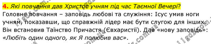 4. Які повчання дав Христос учням під час Таємної Вечері? Головне повчання – заповідь любові та служіння: Ісус умив ноги учням, показавши, що справжній лідер має бути слугою для інших. Він встановив Таїнство Причастя (Євхаристії). Дав «нову заповідь»: «Любіть один одного, як Я полюбив вас».