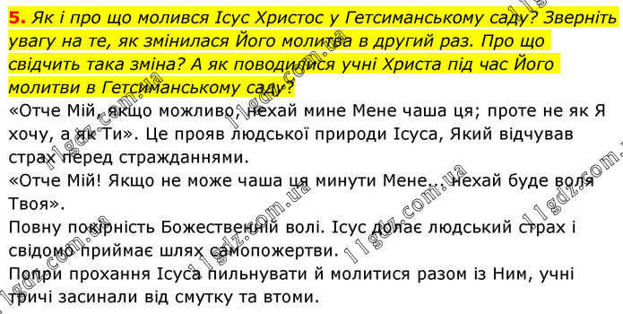5. Як і про що молився Ісус Христос у Гетсиманському саду? Зверніть увагу на те, як змінилася Його молитва в другий раз. Про що свідчить така зміна? А як поводилися учні Христа під час Його молитви в Гетсиманському саду? «Отче Мій, якщо можливо, нехай мине Мене чаша ця; проте не як Я хочу, а як Ти». Це прояв людської природи Ісуса, Який відчував страх перед стражданнями. «Отче Мій! Якщо не може чаша ця минути Мене... нехай буде воля Твоя». Повну покірність Божественній волі. Ісус долає людський страх і свідомо приймає шлях самопожертви. Попри прохання Ісуса пильнувати й молитися разом із Ним, учні тричі засинали від смутку та втоми.