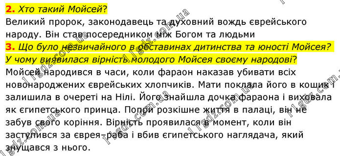 2. Хто такий Мойсей? Великий пророк, законодавець та духовний вождь єврейського народу. Він став посередником між Богом та людьми. 3. Що було незвичайного в обставинах дитинства та юності Мойсея? У чому виявилася вірність молодого Мойсея своєму народові? Мойсей народився в часи, коли фараон наказав убивати всіх новонароджених єврейських хлопчиків. Мати поклала його в кошик і залишила в очереті на Нілі. Його знайшла дочка фараона і виховала як єгипетського принца. Попри розкішне життя в палаці, він не забув свого коріння. Вірність проявилася в момент, коли він заступився за єврея–раба і вбив єгипетського наглядача, який знущався з нього.