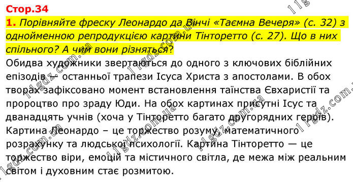 1. Порівняйте фреску Леонардо да Вінчі «Таємна Вечеря» (с. 32) з однойменною репродукцією картини Тінторетто (с. 27). Що в них спільного? А чим вони різняться? Обидва художники звертаються до одного з ключових біблійних епізодів — останньої трапези Ісуса Христа з апостолами. В обох творах зафіксовано момент встановлення таїнства Євхаристії та пророцтво про зраду Юди. На обох картинах присутні Ісус та дванадцять учнів (хоча у Тінторетто багато другорядних героїв). Картина Леонардо – це торжество розуму, математичного розрахунку та людської психології. Картина Тінторетто — це торжество віри, емоцій та містичного світла, де межа між реальним світом і духовним стає розмитою.
