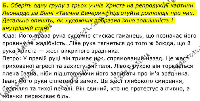 Б. Оберіть одну групу з трьох учнів Христа на репродукції картини Леонардо да Вінчі «Таємна Вечеря» і підготуйте розповідь про них. Детально опишіть, як художник зобразив їхню зовнішність і внутрішній стан. Юда: Його права рука судомно стискає гаманець, що позначає його провину та жадібність. Ліва рука тягнеться до того ж блюда, що й рука Христа — жест викритого зрадника. Петро: У правій руці він тримає ніж, спрямований назад. Це жест прихованої агресії та захисту Вчителя. Лівою рукою він торкається плеча Івана, ніби підштовхуючи його запитати про ім'я зрадника. Іван: Його руки сплетені в замок. Це жест глибокого смирення, безсилля та тихої печалі. Він єдиний, хто не протестує активно, а мовчки переживає біль.