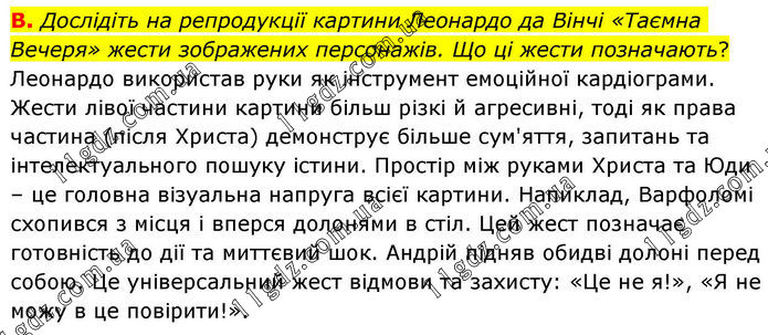 В. Дослідіть на репродукції картини Леонардо да Вінчі «Таємна Вечеря» жести зображених персонажів. Що ці жести позначають? Леонардо використав руки як інструмент емоційної кардіограми. Жести лівої частини картини більш різкі й агресивні, тоді як права частина (після Христа) демонструє більше сум'яття, запитань та інтелектуального пошуку істини. Простір між руками Христа та Юди – це головна візуальна напруга всієї картини. Напиклад, Варфоломі схопився з місця і вперся долонями в стіл. Цей жест позначає готовність до дії та миттєвий шок. Андрій підняв обидві долоні перед собою. Це універсальний жест відмови та захисту: «Це не я!», «Я не можу в це повірити!».