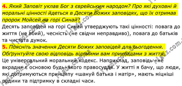 4. Який Заповіт уклав Бог з єврейським народом? Про які духовні й моральні цінності йдеться в Десяти Божих заповідях, що їх отримав пророк Мойсей на горі Синай? Десять заповідей на горі Синай утверджують такі цінності: повага до життя (не вбий), чесність (не свідчи неправдиво), повага до батьків та чистота думок. 5. Поясніть значення Десяти Божих заповідей для сьогодення. Обґрунтуйте свою відповідь відомими вам прикладами з життя. Це універсальний моральний кодекс. Наприклад, заповідь «не вкради» є основою будь–якого правосуддя. У житті я бачу, що люди, які дотримуються принципу «шануй батька і матір», мають міцніші родини та підтримку в складні часи.