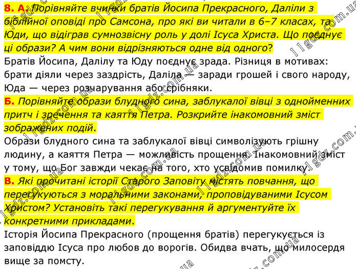 8. А. Порівняйте вчинки братів Йосипа Прекрасного, Даліли з біблійної оповіді про Самсона, про які ви читали в 6–7 класах, та Юди, що відіграв сумнозвісну роль у долі Ісуса Христа. Що поєднує ці образи? А чим вони відрізняються одне від одного? Братів Йосипа, Далілу та Юду поєднує зрада. Різниця в мотивах: брати діяли через заздрість, Даліла — заради грошей і свого народу, Юда — через розчарування або срібняки. Б. Порівняйте образи блудного сина, заблукалої вівці з однойменних притч і зречення та каяття Петра. Розкрийте інакомовний зміст зображених подій. Образи блудного сина та заблукалої вівці символізують грішну людину, а каяття Петра — можливість прощення. Інакомовний зміст у тому, що Бог завжди чекає на того, хто усвідомив помилку. В. Які прочитані історії Старого Заповіту містять повчання, що перегукуються з моральними законами, проповідуваними Ісусом Христом? Установіть такі перегукування й аргументуйте їх конкретними прикладами. Історія Йосипа Прекрасного (прощення братів) перегукується із заповіддю Ісуса про любов до ворогів. Обидва вчать, що милосердя вище за помсту.