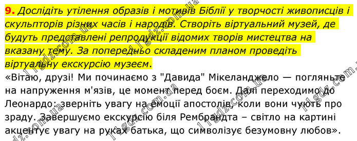 9. Дослідіть утілення образів і мотивів Біблії у творчості живописців і скульпторів різних часів і народів. Створіть віртуальний музей, де будуть представлені репродукції відомих творів мистецтва на вказану тему. За попередньо складеним планом проведіть віртуальну екскурсію музеєм. «Вітаю, друзі! Ми починаємо з "Давида" Мікеланджело — погляньте на напруження м'язів, це момент перед боєм. Далі переходимо до Леонардо: зверніть увагу на емоції апостолів, коли вони чують про зраду. Завершуємо екскурсію біля Рембрандта – світло на картині акцентує увагу на руках батька, що символізує безумовну любов».