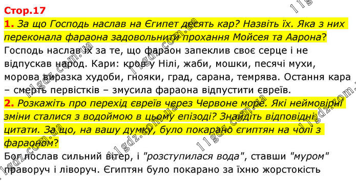 1. За що Господь наслав на Єгипет десять кар? Назвіть їх. Яка з них переконала фараона задовольнити прохання Мойсея та Аарона? Господь наслав їх за те, що фараон запеклив своє серце і не відпускав народ. Кари: кров у Нілі, жаби, мошки, песячі мухи, морова виразка худоби, гнояки, град, сарана, темрява. Остання кара – смерть первістків – змусила фараона відпустити євреїв. 2. Розкажіть про перехід євреїв через Червоне море. Які неймовірні зміни сталися з водоймою в цьому епізоді? Знайдіть відповідні цитати. За що, на вашу думку, було покарано єгиптян на чолі з фараоном? Бог послав сильний вітер, і "розступилася вода", ставши "муром" праворуч і ліворуч. Єгиптян було покарано за їхню жорстокість.