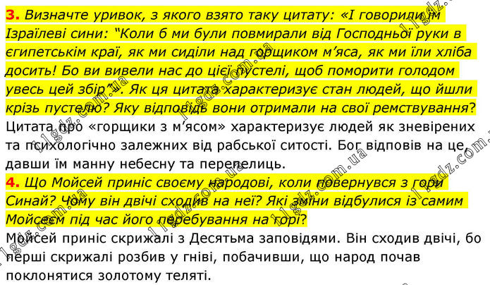 3. Визначте уривок, з якого взято таку цитату: «І говорили їм Ізраїлеві сини: “Коли б ми були повмирали від Господньої руки в єгипетськім краї, як ми сиділи над горщиком м’яса, як ми їли хліба досить! Бо ви вивели нас до цієї пустелі, щоб поморити голодом увесь цей збір”». Як ця цитата характеризує стан людей, що йшли крізь пустелю? Яку відповідь вони отримали на свої ремствування? Цитата про «горщики з м’ясом» характеризує людей як зневірених та психологічно залежних від рабської ситості. Бог відповів на це, давши їм манну небесну та перепелиць. 4. Що Мойсей приніс своєму народові, коли повернувся з гори Синай? Чому він двічі сходив на неї? Які зміни відбулися із самим Мойсеєм під час його перебування на горі? Мойсей приніс скрижалі з Десятьма заповідями. Він сходив двічі, бо перші скрижалі розбив у гніві, побачивши, що народ почав поклонятися золотому теляті.