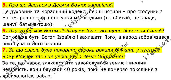 5. Про що йдеться в Десяти Божих заповідях? Це духовний та моральний кодекс: перші чотири – про стосунки з Богом, решта – про стосунки між людьми (не вбивай, не кради, шануй батьків тощо). 6. Яку угоду між Богом та людьми було укладено біля гори Синай? Бог обіцяв бути Богом Ізраїлю і захищати його, а народ зобов'язався виконувати Його закони. 7. За що євреїв було покарано сорока роками блукань у пустелі? Чому Мойсей так і не увійшов до Землі Обітованої? За те, що народ злякався йти завойовувати землю і виявив невірність, вони блукали 40 років, поки не померло покоління з «психологією раба».