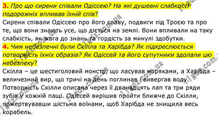 3. Про що сирени співали Одіссею? На які душевні слабкості подорожніх впливав їхній спів? Сирени співали Одіссею про його славу, подвиги під Троєю та про те, що вони знають усе, що діється на землі. Вони впливали на таку слабкість, як жага до знань та гордість за минулі здобутки. 4. Чим небезпечні були Скілла та Харібда? Як підкреслюється потворність їхніх образів? Як Одіссей та його супутники здолали цю небезпеку? Скілла – це шестиголовий монстр, що ласував моряками, а Харібда – величезний вир, що тричі на день поглинав і вивергав воду. Потворність Скілли описана через її дванадцять лап та три ряди зубів у кожній пащі. Одіссей вирішив пройти ближче до Скілли, пожертвувавши шістьма воїнами, щоб Харібда не знищила весь корабель.