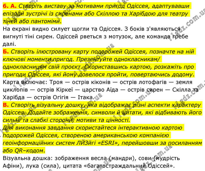 6. А. Створіть виставу за мотивами пригод Одіссея, адаптувавши епізоди зустрічі із сиренами або Скіллою та Харібдою для театру тіней або пантоміми. На екрані видно силует щогли та Одіссея. З боків з'являються вигнуті тіні сирен. Одіссей рветься з мотузок, але команда гребе далі. Б. Створіть ілюстровану карту подорожей Одіссея, позначте на ній ключові моменти пригод. Презентуйте однокласникам/ однокласницям свій проєкт. Скориставшись картою, розкажіть про пригоди Одіссея, які йому довелося пройти, повертаючись додому. Карта включає: Троя — острів кіконів — острів лотофагів — земля циклопів — острів Кіркеї — царство Аїда — острів сирен — Скілла та Харібда — острів Огігія — Ітака. В. Створіть візуальну дошку, яка відображає різні аспекти характеру Одіссея. Додайте зображення, символи й цитати, які відбивають його сильні та слабкі сторони, мотиви та цінності. Для виконання завдання скористайтеся інтерактивною картою подорожей Одіссея, створеною американською компанією геоінформаційних систем ЛЙЗйгі «ESRI», перейшовши за посиланням або QR–кодом. Візуальна дошка: зображення весла (мандри), сови (мудрість Афіни), лука (сила), цитата «багатостраждальний Одіссей».