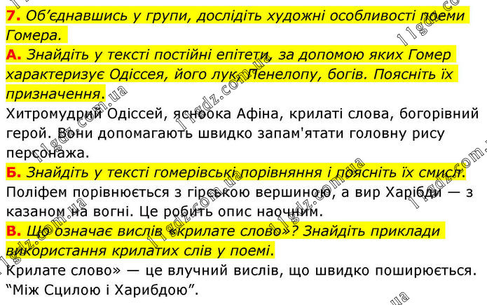 7. Об’єднавшись у групи, дослідіть художні особливості поеми Гомера. А. Знайдіть у тексті постійні епітети, за допомою яких Гомер характеризує Одіссея, його лук, Пенелопу, богів. Поясніть їх призначення. Хитромудрий Одіссей, ясноока Афіна, крилаті слова, богорівний герой. Вони допомагають швидко запам'ятати головну рису персонажа. Б. Знайдіть у тексті гомерівські порівняння і поясніть їх смисл. Поліфем порівнюється з гірською вершиною, а вир Харібди — з казаном на вогні. Це робить опис наочним. В. Що означає вислів «крилате слово»? Знайдіть приклади використання крилатих слів у поемі. Крилате слово» — це влучний вислів, що швидко поширюється. “Між Сцилою і Харибдою”.