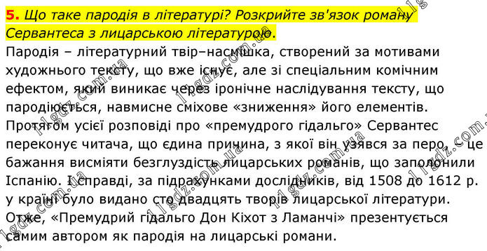 5. Що таке пародія в літературі? Розкрийте зв'язок роману Сервантеса з лицарською літературою. Пародія – літературний твір–насмішка, створений за мотивами художнього тексту, що вже існує, але зі спеціальним комічним ефектом, який виникає через іронічне наслідування тексту, що пародіюється, навмисне сміхове «зниження» його елементів. Протягом усієї розповіді про «премудрого гідальго» Сервантес переконує читача, що єдина причина, з якої він узявся за перо, – це бажання висміяти безглуздість лицарських романів, що заполонили Іспанію. І справді, за підрахунками дослідників, від 1508 до 1612 р. у країні було видано сто двадцять творів лицарської літератури. Отже, «Премудрий гідальго Дон Кіхот з Ламанчі» презентується самим автором як пародія на лицарські романи.