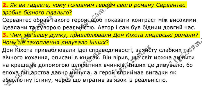 2. Як ви гадаєте, чому головним героєм свого роману Сервантес зробив бідного гідальго? Сервантес обрав такого героя, щоб показати контраст між високими ідеалами та суворою реальністю. Автор і сам був бідним довгий час. 3. Чим, на вашу думку, приваблювали Дон Кіхота лицарські романи? Чому це захоплення дивувало інших? Дон Кіхота приваблювали ідеї справедливості, захисту слабких та вічного кохання, описані в книгах. Він вірив, що світ можна змінити на краще за допомогою шляхетних вчинків. Інших це дивувало, бо епоха лицарства давно минула, а герой сприймав вигадки як абсолютну істину, через що втратив зв'язок із реальністю.