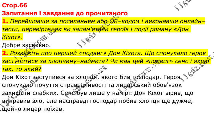 Запитання і завдання до прочитаного 1. Перейшовши за посиланням або QR–кодом і виконавши онлайн–тести, перевірте, як ви запам'ятали героїв і події роману «Дон Кіхот». Добре засвоєно. 2. Розкажіть про перший «подвиг» Дон Кіхота. Що спонукало героя заступитися за хлопчину–наймита? Чи мав цей «подвиг» сенс і якщо так, то який? Дон Кіхот заступився за хлопця, якого бив господар. Героя спонукало почуття справедливості та лицарський обов'язок захищати слабких. Сенс був лише у намірі: Дон Кіхот вірив, що виправив зло, але насправді господар побив хлопця ще дужче, щойно лицар поїхав.