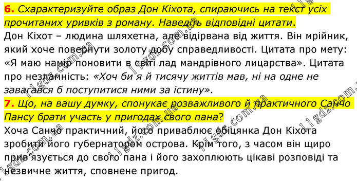 6. Схарактеризуйте образ Дон Кіхота, спираючись на текст усіх прочитаних уривків з роману. Наведіть відповідні цитати. Дон Кіхот – людина шляхетна, але відірвана від життя. Він мрійник, який хоче повернути золоту добу справедливості. Цитата про мету: «Я маю намір поновити в світі лад мандрівного лицарства». Цитата про незламність: «Хоч би я й тисячу життів мав, ні на одне не завагався б поступитися ними за істину». 7. Що, на вашу думку, спонукає розважливого й практичного Санчо Пансу брати участь у пригодах свого пана? Хоча Санчо практичний, його приваблює обіцянка Дон Кіхота зробити його губернатором острова. Крім того, з часом він щиро прив’язується до свого пана і його захоплюють цікаві розповіді та незвичне життя, сповнене пригод.