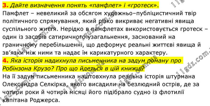 3. Дайте визначення понять «памфлет» і «гротеск». Памфлет – невеликий за обсягом художньо–публіцистичний твір політичного спрямування, який різко викриває негативні явища суспільного життя. Нерідко в памфлетах використовується гротеск – один із засобів сатиричного узагальнення, заснований на граничному перебільшенні, що деформує реальні життєві явища й зв’язки між ними та надає їм карикатурного характеру. 4. Яка історія надихнула письменника на задум роману про Робінзона Крузо? Про що йдеться в цій книжці? На її задум письменника наштовхнула реальна історія штурмана Олександра Селкірка, якого висадили на безлюдний острів, де за чотири роки й чотири місяці його підібрало судно із флотилії капітана Роджерса.