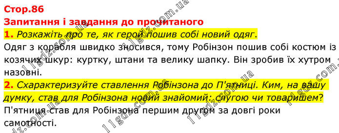 Запитання і завдання до прочитаного 1. Розкажіть про те, як герой пошив собі новий одяг. Одяг з корабля швидко зносився, тому Робінзон пошив собі костюм із козячих шкур: куртку, штани та велику шапку. Він зробив їх хутром назовні. 2. Схарактеризуйте ставлення Робінзона до П'ятниці. Ким, на вашу думку, став для Робінзона новий знайомий: слугою чи товаришем? П'ятниця став для Робінзона першим другом за довгі роки самотності.