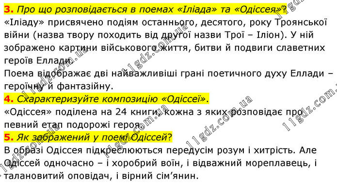 3. Про що розповідається в поемах «Іліада» та «Одіссея»? «Іліаду» присвячено подіям останнього, десятого, року Троянської війни (назва твору походить від другої назви Трої – Іліон). У ній зображено картини військового життя, битви й подвиги славетних героїв Еллади. Поема відображає дві найважливіші грані поетичного духу Еллади – героїчну й фантазійну. 4. Схарактеризуйте композицію «Одіссеї». «Одіссея» поділена на 24 книги, кожна з яких розповідає про певний етап подорожі героя. 5. Як зображений у поемі Одіссей? В образі Одіссея підкреслюються передусім розум і хитрість. Але Одіссей одночасно – і хоробрий воїн, і відважний мореплавець, і талановитий оповідач, і вірний сім’янин.