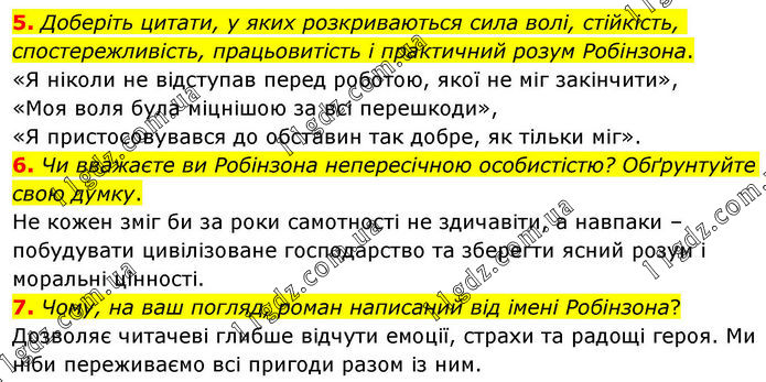5. Доберіть цитати, у яких розкриваються сила волі, стійкість, спостережливість, працьовитість і практичний розум Робінзона. «Я ніколи не відступав перед роботою, якої не міг закінчити», «Моя воля була міцнішою за всі перешкоди», «Я пристосовувався до обставин так добре, як тільки міг». 6. Чи вважаєте ви Робінзона непересічною особистістю? Обґрунтуйте свою думку. Не кожен зміг би за роки самотності не здичавіти, а навпаки – побудувати цивілізоване господарство та зберегти ясний розум і моральні цінності. 7. Чому, на ваш погляд, роман написаний від імені Робінзона? Дозволяє читачеві глибше відчути емоції, страхи та радощі героя. Ми ніби переживаємо всі пригоди разом із ним.