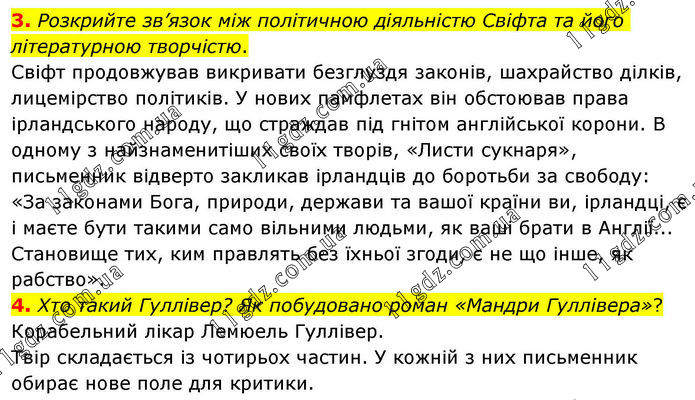 3. Розкрийте зв’язок між політичною діяльністю Свіфта та його літературною творчістю. Свіфт продовжував викривати безглуздя законів, шахрайство ділків, лицемірство політиків. У нових памфлетах він обстоював права ірландського народу, що страждав під гнітом англійської корони. В одному з найзнаменитіших своїх творів, «Листи сукнаря», письменник відверто закликав ірландців до боротьби за свободу: «За законами Бога, природи, держави та вашої країни ви, ірландці, є і маєте бути такими само вільними людьми, як ваші брати в Англії... Становище тих, ким правлять без їхньої згоди, є не що інше, як рабство». 4. Хто такий Гуллівер? Як побудовано роман «Мандри Гуллівера»? Корабельний лікар Лемюель Гуллівер. Твір складається із чотирьох частин. У кожній з них письменник обирає нове поле для критики.