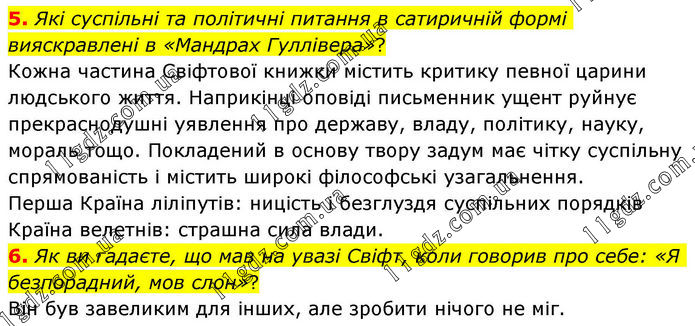 5. Які суспільні та політичні питання в сатиричній формі вияскравлені в «Мандрах Гуллівера»? Кожна частина Свіфтової книжки містить критику певної царини людського життя. Наприкінці оповіді письменник ущент руйнує прекраснодушні уявлення про державу, владу, політику, науку, мораль тощо. Покладений в основу твору задум має чітку суспільну спрямованість і містить широкі філософські узагальнення. Перша Країна ліліпутів: ницість і безглуздя суспільних порядків Країна велетнів: страшна сила влади. 6. Як ви гадаєте, що мав на увазі Свіфт, коли говорив про себе: «Я безпорадний, мов слон»? Він був завеликим для інших, але зробити нічого не міг.