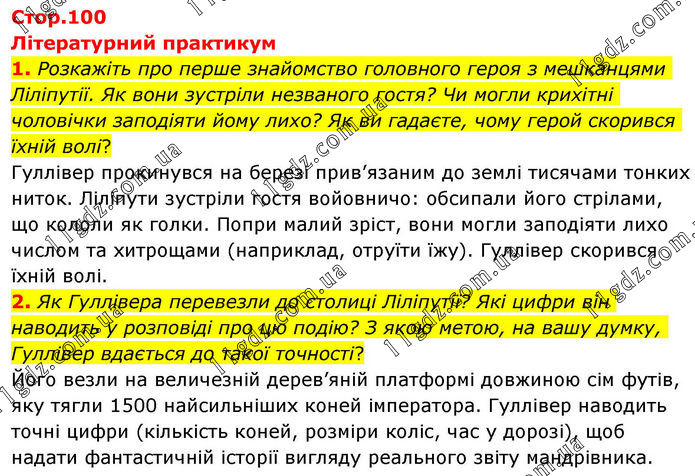 Літературний практикум 1. Розкажіть про перше знайомство головного героя з мешканцями Ліліпутії. Як вони зустріли незваного гостя? Чи могли крихітні чоловічки заподіяти йому лихо? Як ви гадаєте, чому герой скорився їхній волі? Гуллівер прокинувся на березі прив’язаним до землі тисячами тонких ниток. Ліліпути зустріли гостя войовничо: обсипали його стрілами, що кололи як голки. Попри малий зріст, вони могли заподіяти лихо числом та хитрощами (наприклад, отруїти їжу). Гуллівер скорився їхній волі. 2. Як Гуллівера перевезли до столиці Ліліпутії? Які цифри він наводить у розповіді про цю подію? З якою метою, на вашу думку, Гуллівер вдається до такої точності? Його везли на величезній дерев’яній платформі довжиною сім футів, яку тягли 1500 найсильніших коней імператора. Гуллівер наводить точні цифри (кількість коней, розміри коліс, час у дорозі), щоб надати фантастичній історії вигляду реального звіту мандрівника.