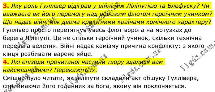 3. Яку роль Гуллівер відіграв у війні між Ліліпутією та Блефуску? Чи вважаєте ви його перемогу над ворожим флотом героїчним учинком? Що надає війні між двома крихітними країнами комічного характеру? Гуллівер просто перетягнув увесь флот ворога на мотузках до берега Ліліпутії. Це не стільки героїчний учинок, скільки технічна перевага велетня. Війні надає комізму причина конфлікту: з якого кінця розбивати варене яйце. 4. Які епізоди прочитаної частини твору здалися вам найсмішнішими? Перекажіть їх. Смішно було читати, як ліліпути складали акт обшуку Гуллівера, сприймаючи його годинник за бога, якому він поклоняється.